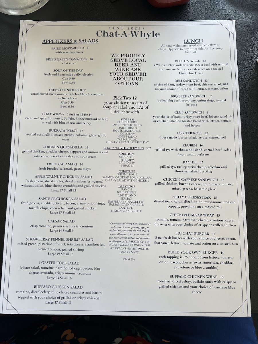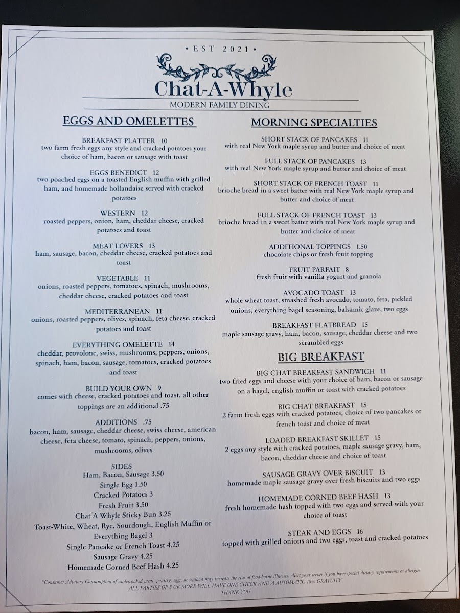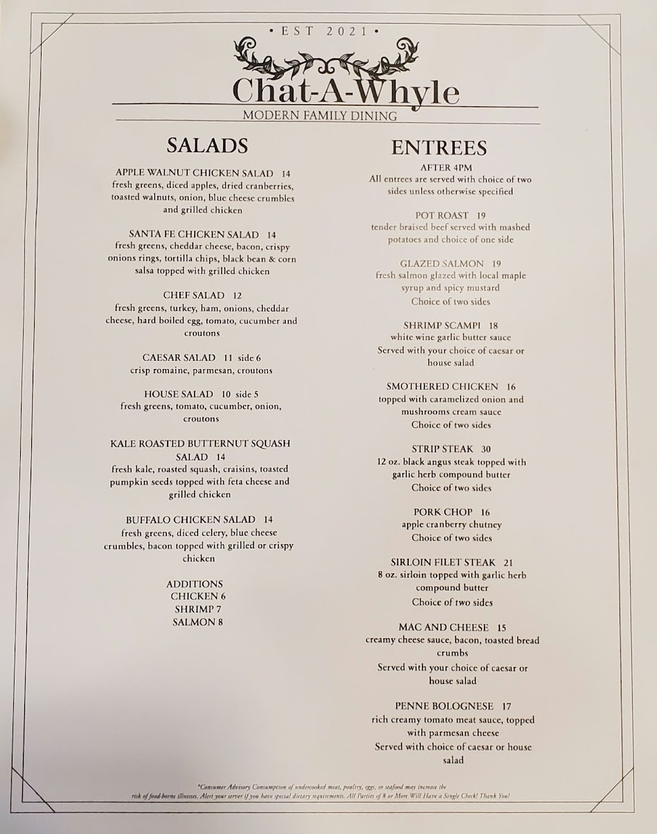 Chat-A-Whyle Restaurant Menu